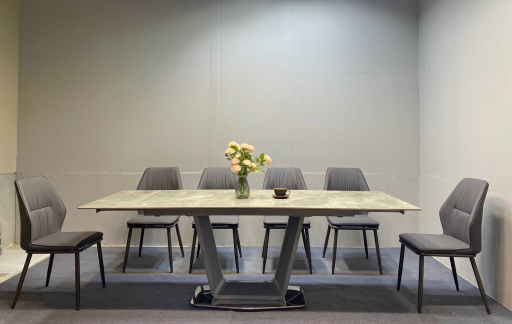 Bộ bàn ghế ăn thông minh gấp gọn 6 ghế kevin BBAT-07 với mặt bàn đá ceramic thông minh kéo dài kết hợp 6 ghế bọc da chân thép hiện đại mang tới sự tiện dụng bền đẹp lâu dài nhờ khả năng chống xước, chống bám bụi, dễ dàng vệ sinh. Đây chính là lựa chọn hoàn hảo cho không gian bếp của gia đình bạn.