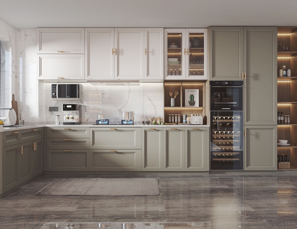 1. Phong Cách Tân Cổ Điển: Tủ bếp này được thiết kế theo phong cách tân cổ điển, kết hợp giữa vẻ đẹp cổ điển và sự hiện đại. Với các đường nét tỉ mỉ, hoa văn tinh tế, sản phẩm mang đến không gian bếp lịch lãm và sang trọng.