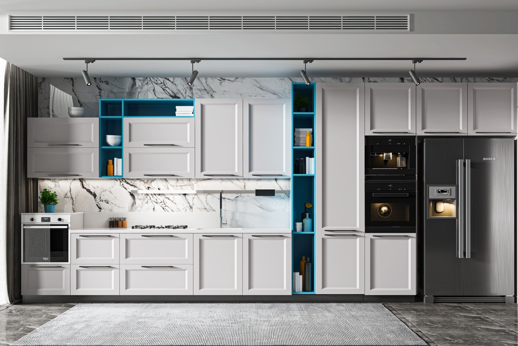 1. Phong Cách Tân Cổ Điển: Tủ bếp này được thiết kế theo phong cách tân cổ điển, kết hợp giữa vẻ đẹp cổ điển và sự hiện đại. Với các đường nét tỉ mỉ, hoa văn tinh tế, sản phẩm mang đến không gian bếp lịch lãm và sang trọng.